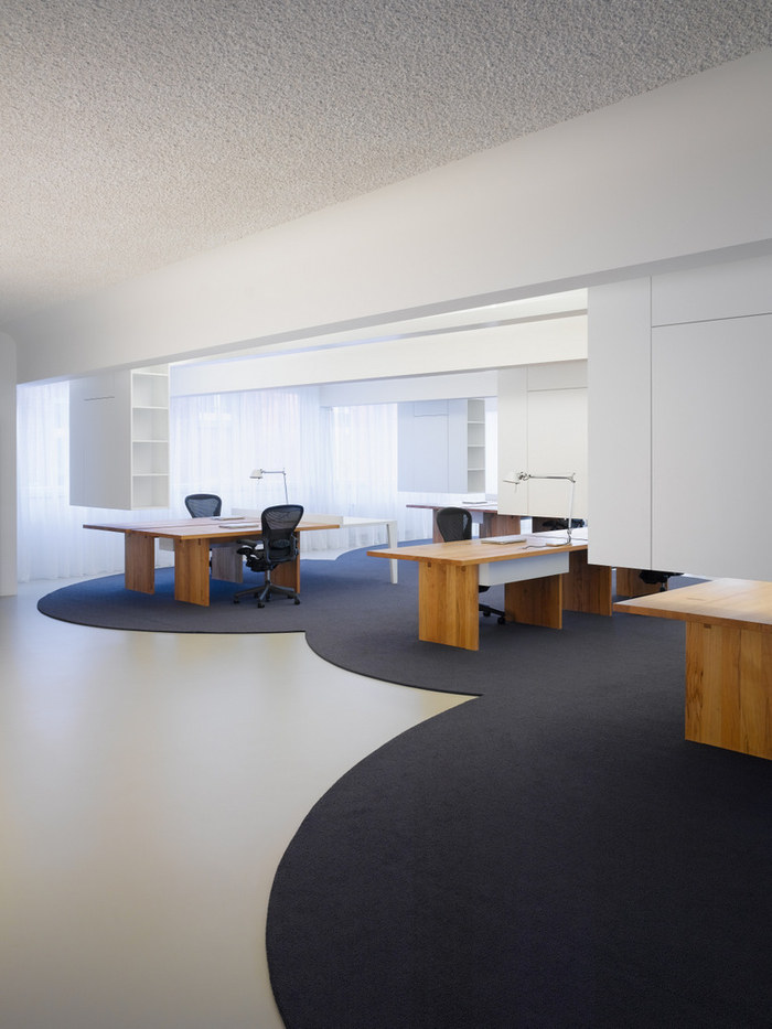 整个这些区域的天花板都用灰泥覆盖,为商业环境带来家常、熟悉、公寓般的感觉。一旦进入主要工作空间,搁架单元就挂在天花板上,这实际上很好地打破了房间的大小。