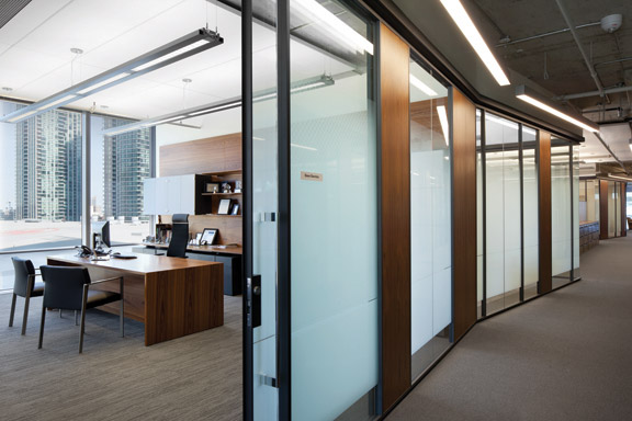 步入接待区,多伦多天际线的壮丽景色在一侧由三个独立的石墙构成,墙壁由粗糙的裂面石组成,灵感来自从岩石中凿出的垂直悬崖的照片,而铜和胡桃木的艺术作品唤起了地球的地层和蜿蜒的铜线倒入公司铸造厂的模具中。