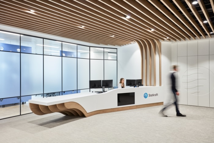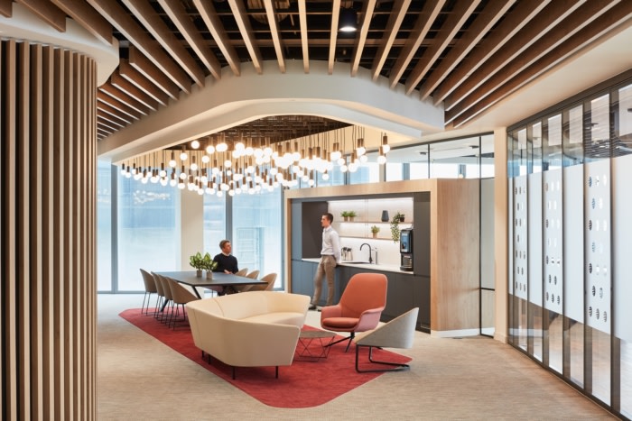 一进门,游客就会看到一个令人印象深刻的接待台,上面有公司标志和模仿自然的几何木材形式,与坚硬的白色饰面并列,放大了自然和人造物体之间的联系。这个空间然后溢出到客户套房,用户通过重复的几何形式的持续使用被吸引穿过空间,并在主要客户等候区看到引人注目的照明功能。这种低悬的照明为空间营造了一种亲密的感觉,让工作人员和访客在等待被带到许多相邻的会议室之一的同时,在这个空间内进行协作时感到足够舒适。