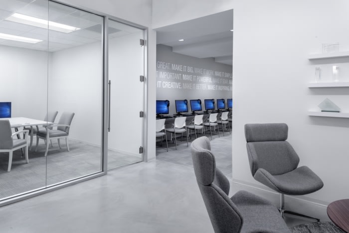 在公司标志和座位上可以找到亮橙色的微妙时刻。该布局包含用于灵活会议或工作空间的各种座位选择、带可调节高度的工作站的多数开放式平面图,以及带家庭式餐桌的休息室,可通向协作区以供全体会议。