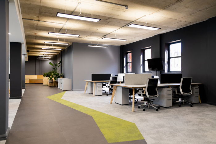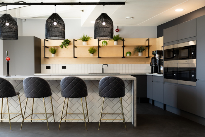 灯箱指示团队区域,这些区域由特色细木工和绿色植物自然分隔,令人印象深刻的接待处设有定制办公桌,毗邻私人精品会议空间。