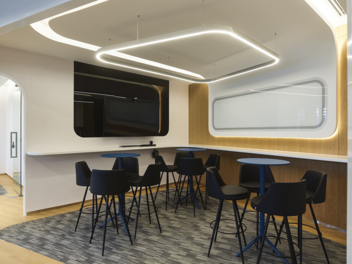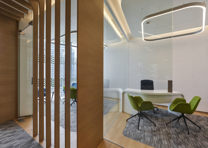 离散部分的谐波成分是通过重复和交替使用计算设计过程获得的五个不同轮廓来实现的。该设计采用了几件定制家具,利用数字设计过程,墙壁系统通过木门内雕刻的一系列厚度可变的垂直凹槽集成了公司徽标。会议室桌子还设有由木质部分制成的有机形状底座,座椅系统采用流畅的弧形设计,非常适合非正式会议。#办公室设计装修#