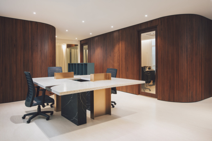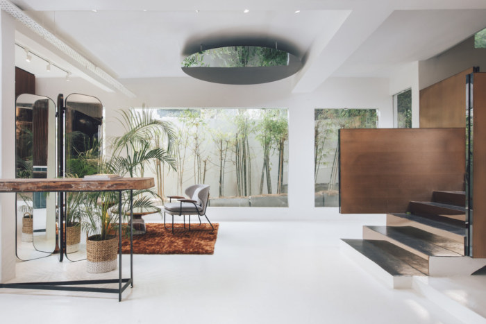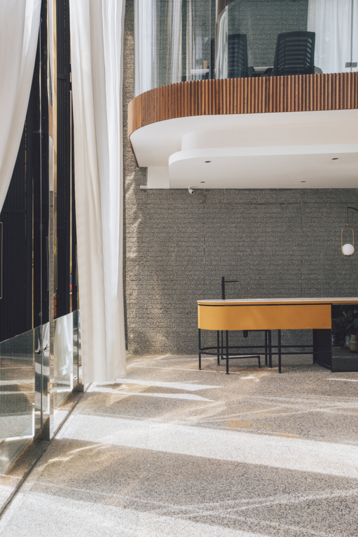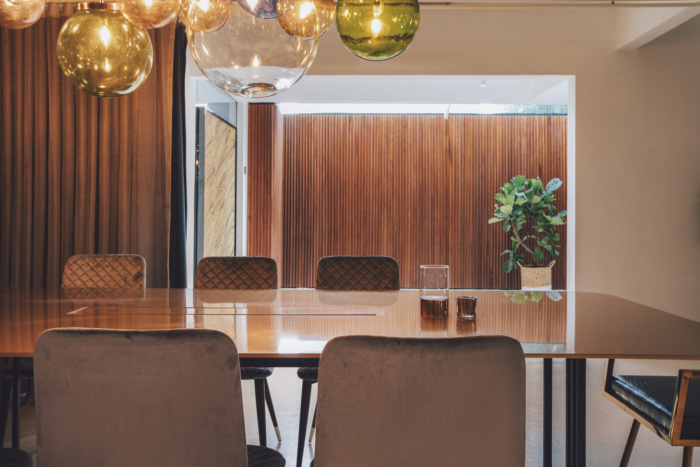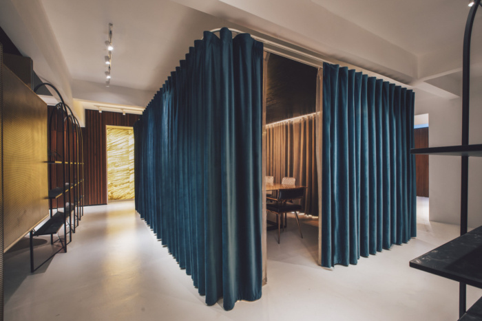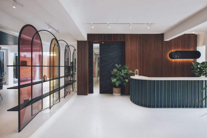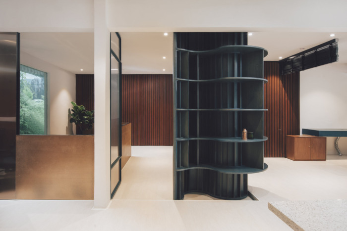 房间周围环绕着厚重但郁郁葱葱的翠绿色隐私窗帘。不使用时保持打开状态,窗帘提供了空间的灵活使用,打开了水平的核心,而不是进一步分割它。在它的边界上是一对细长的拱形半透明屏风,进一步有助于构建开放空间。这些不同柔和霓虹色调的半透明面板设计独特,细节丰富,被包裹在黑色薄钢框架中,可兼作特色展示架,从不同方向观看时,为空间增添视觉趣味和深度,产生不同的结果,在多次叠加多层颜色或半透明颜色前景的轮廓与背景周围的材料和饰面相融合。