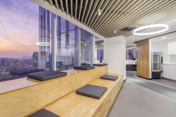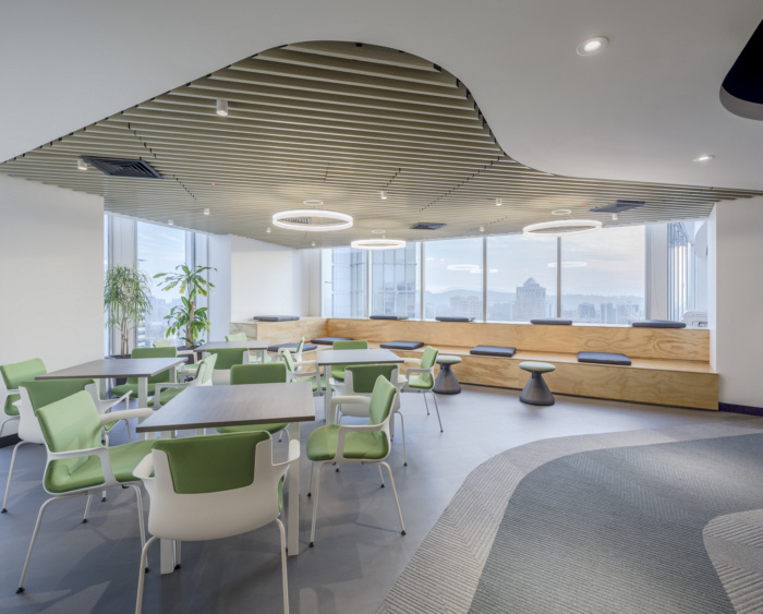 它带有柔软角落的圆形循环给人一种流动和友好的感觉,公司寻求提供一种环境,让员工可以培养牢固的联系。周边看台允许多功能空间从礼堂过渡到不太正式的会议场所。作为一个用餐区,它给人的印象是在“公园”或办公室外的“休息”。