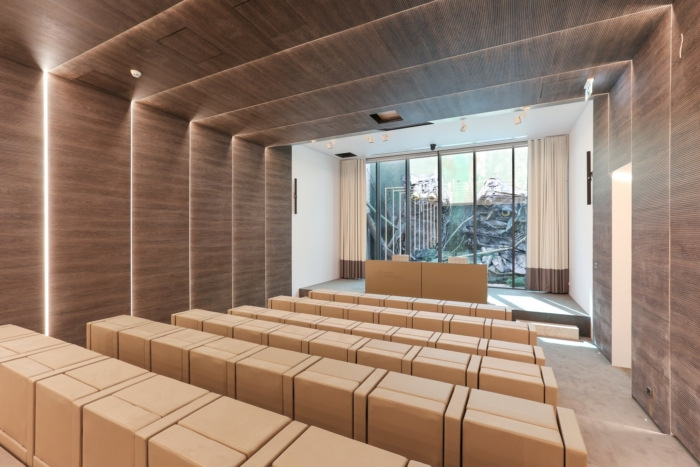 该建筑的主入口位于西侧,位于两卷之间,从中您可以进入一个连接到接待处的中庭。办公室的社交区域位于一楼,包括 14 间会议室、一间带小厨房的餐厅和一个可容纳 100 人的礼堂。#专业办公楼设计#