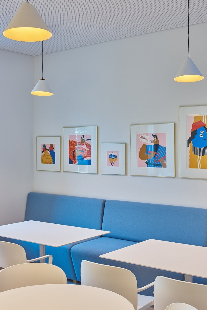 可以称为半开放的工作空间为员工提供隐私和社区感觉。与工作空间的白色和圆形建筑不同,内部会议空间覆盖着混合软吸音板的木板,并以矩形图案排列。