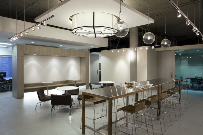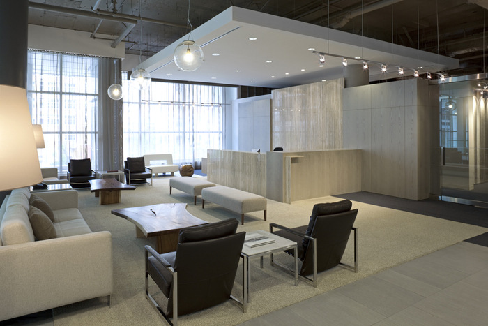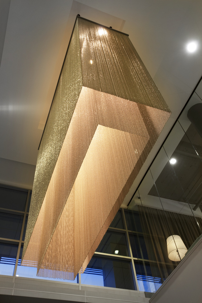 干净的现代细节和建筑形式承认了建筑的现代主义设计,但被软化以营造温馨友好的氛围,并通过自然灵感的调色板和自然纹理和图案突出公司对自然环境的尊重。开放式天花板和大型定制吊坠突出了空间的规模和体积,同时通过家具提供了具有现代经典参考的住宅特征。#办公室空间设计公司#