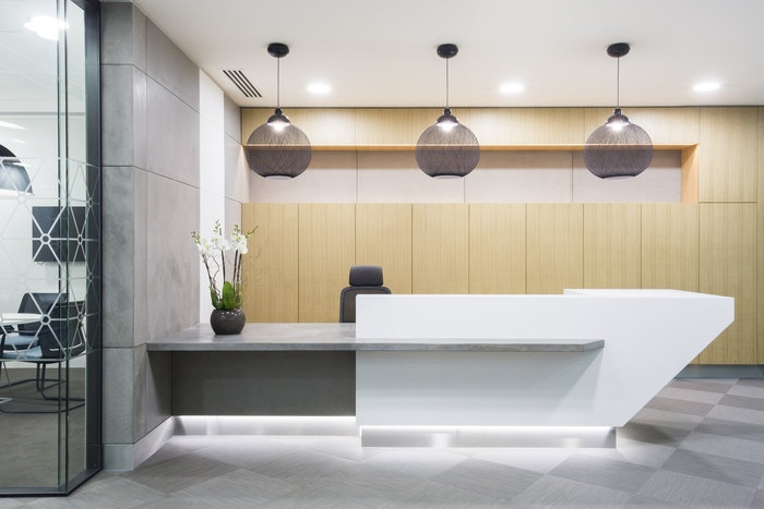 办公室设计装修将现代可丽耐与实心混凝土和橡木镶板形成对比