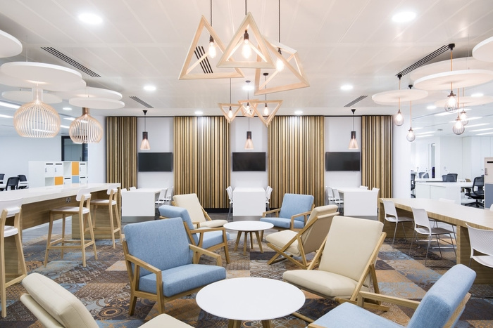 在核心工作区的后端,有三个项目室,带有巧妙的旋转金属网屏,提供半私人空间。所有这些房间都配备了 AV,使其成为小型团队潜入安静时间或小型会议的有用空间。#办公室设计装修方案#