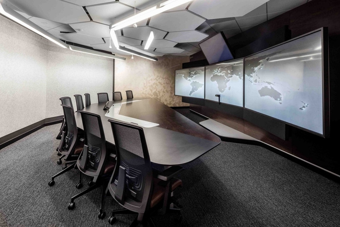 通过霓虹灯、铜管和城市元素等定制组件的对比,河流与城市景观的关系以及鹅卵石般的地毯纹理和颜色反映了布里斯班的河床、水和当地植物群。#公司办公室设计#