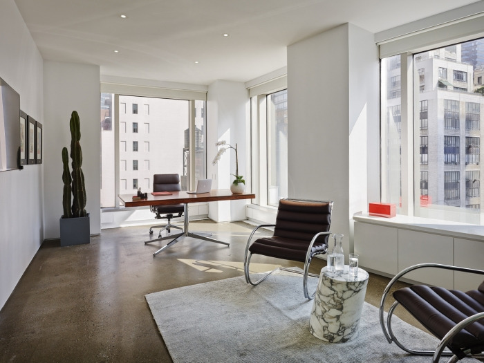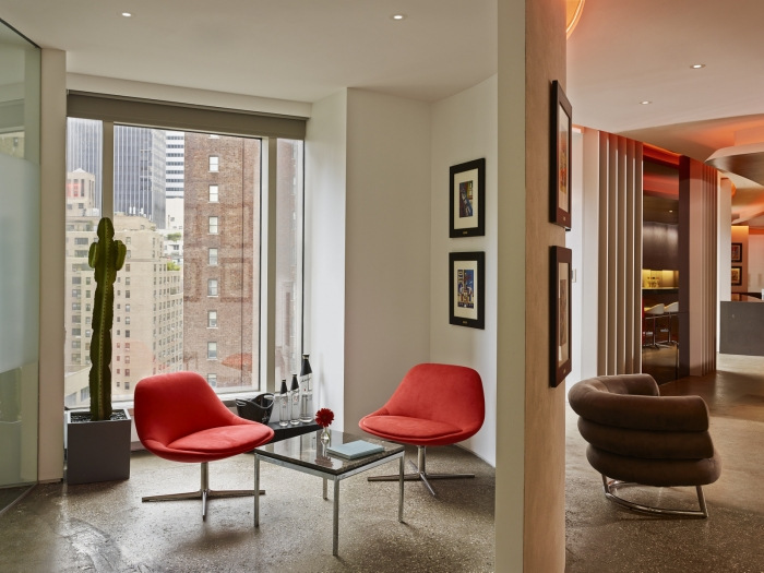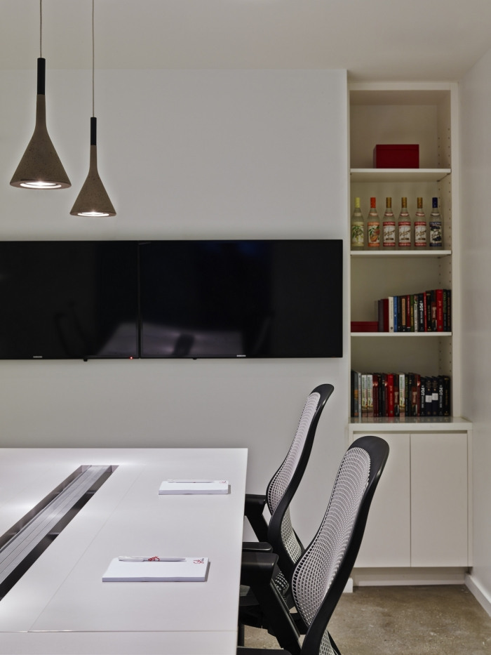 红色玻璃办公桌和超大酒吧点缀着面向公众的活动空间。酒吧里的石灰石向瓶子上的莫斯科酒店致敬。酒吧本身向痴迷于混合学的美国文化致敬,伏特加从来都不是孤立的。除了这个多功能区之外,经典的红色和雅致的家具遍布整个明亮、开放的办公空间。#时尚办公空间设计#
