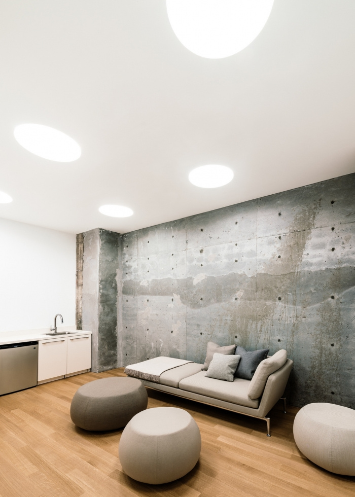 崎岖的周边砖墙、原始的内部混凝土柱和剪力墙、机械管道和电线都暴露在外。接待台后面的一个高大的洒水器立管也故意暴露在外,并在显眼的地方涂上了红色的消防车,以突出并宣布:“我们与众不同。”#专业办公室装修#