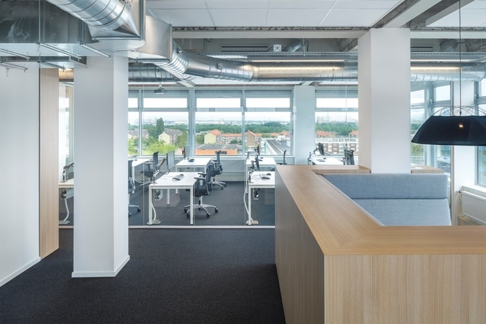 封闭式走廊和独立办公室的传统布局转变为带有隔音天花板的开放式概念。新的室内概念展示了裸露的混凝土结构,优化了刚性战后办公楼的空间品质。#办公楼设计装修#