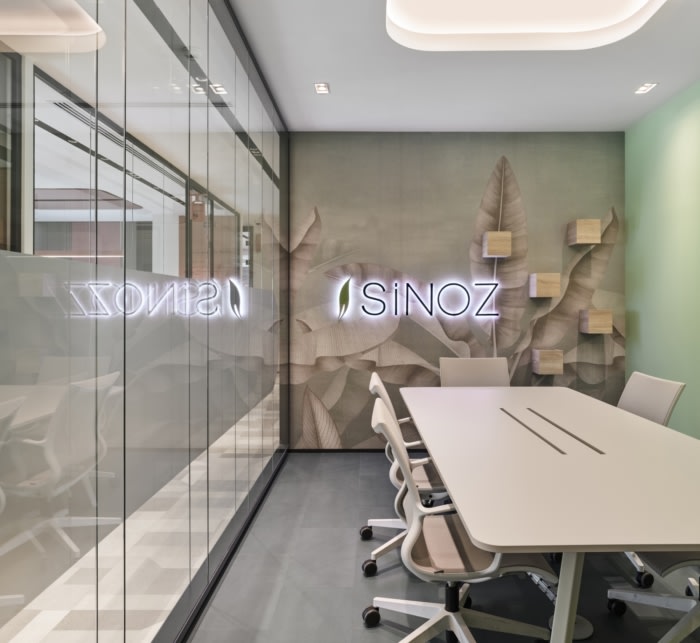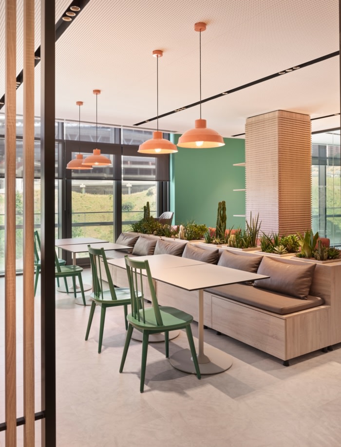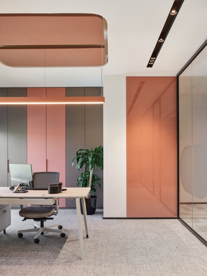 地板和墙壁上经过防腐处理的苔藓线,从入口欢迎我们,将我们从门口带到办公室内部。办公区域的设计从入口和自助餐厅的多彩世界中脱颖而出,变成了一种以单一的鲑鱼色调和极简设计为主的更简单的语言。除了柔和的颜色,整个办公室都使用奶油色和浅色调,这里的目标是创建明亮的办公室,帮助员工更加专注。#办公室的设计#