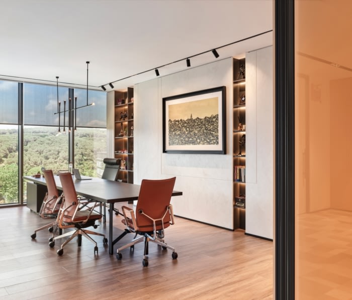 在整个办公室的楼层:流通区、自助餐厅和会议室使用了豪华的乙烯基瓷砖(LVT)材料,而工作区则使用了地毯。覆盖织物的玻璃棉与地毯一起应用于天花板,以帮助办公区域的声学。在许多部门房间里,根据部门的需要,按照特殊生产的线性照明,应用了鲑鱼色的彩绘玻璃。这样,在赋予房间更活泼、更时尚的外观的同时,还创造了玻璃等适合做笔记的表面。根据客户的声学需求,双或单玻璃隔板系统用于房间隔板。#办公室的设计风格#