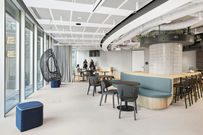 大地板靠向中央客户和员工休息室、员工论坛和厨房,从接待处和会议室通向。从接待处和董事会会议室到中央枢纽的流动促进了透明度和包容性的概念,为员工和客户的大型市政厅会议和社交聚会提供了机会。#办公室装修设计公司#