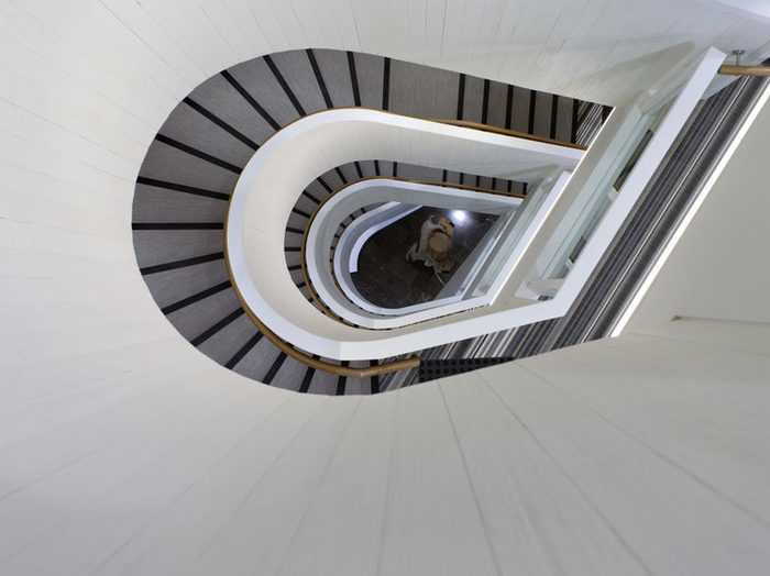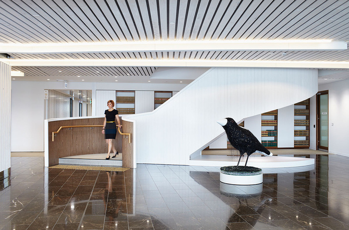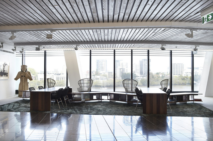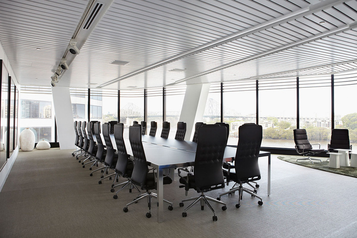 新装修利用了11层提供的布里斯班河和故事桥地标的低层直接景观。周边柱子的雕塑性质进一步说明了通过基础建筑的连接关系,这些柱子不对称地沿着建筑立面向上扭曲。装修通过人体尺度和天然石材的高质感材料、再生木材和应用于内部螺旋楼梯和装修细节的编织细节进一步反映了这种地平面和向上的连通性。#专业办公空间设计公司#