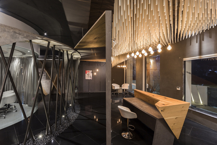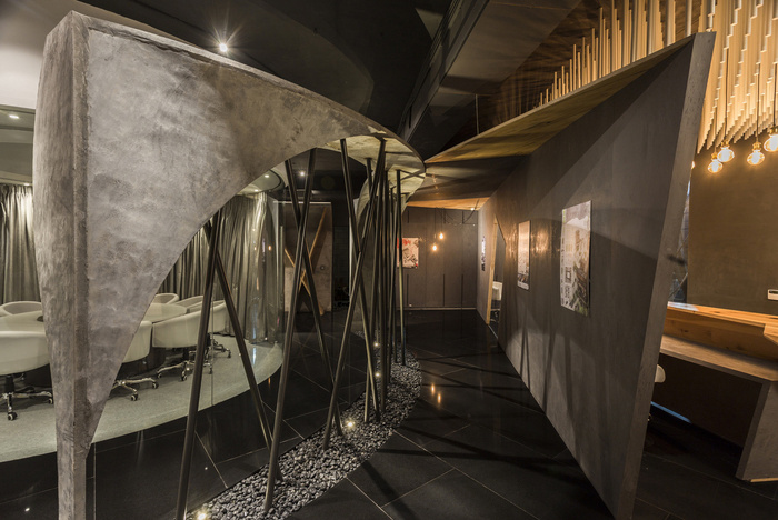 办公室的入口由一扇 9 英尺 x 6 英尺宽的旋转金属门定义,设计由锥形金属管组成。接待区采用参数化设计的装置,使用 1500 根圆形杆悬挂在天花板上的有机波浪结构中。在广阔的空间中创造戏剧性,会议两侧是采用特殊施工技术和加固方法设计的三维曲线结构。黑色镜面花岗岩地板将办公空间的各种元素结合在一起。#办公室空间设计案例#