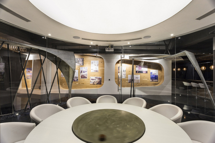 以强烈的雕塑元素为标志,被想象成一个打破刻板印象、打破常规的办公空间。设计师引入了单色组件层,使用参数化建模为空间引入了活力。该设计主要基于一个中央圆形会议室,直径17英尺,采用透明玻璃设计。#办公室空间设计#