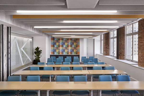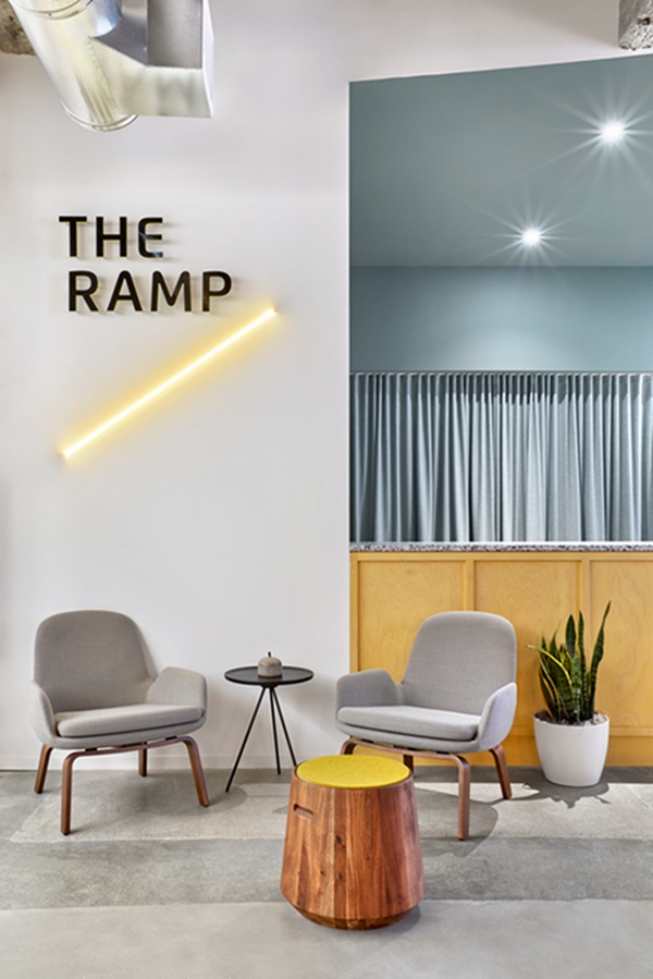 室内地砖和大窗户为工作场所提供了经典的耐力和生命力。办公室的东翼(太阳升起)采用暖色调,而西翼(太阳落山和傍晚到达)则采用凉爽的色彩。对于那些没有地理或太阳方向感的人来说,地板图形使前进的方式变得生动有趣。#办公室装修设计案例#