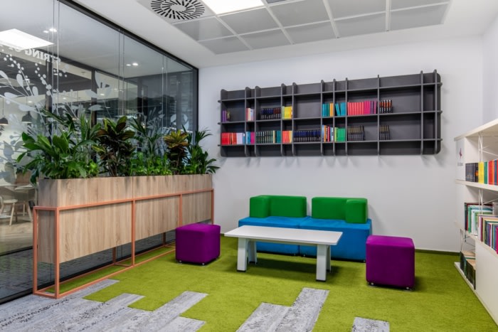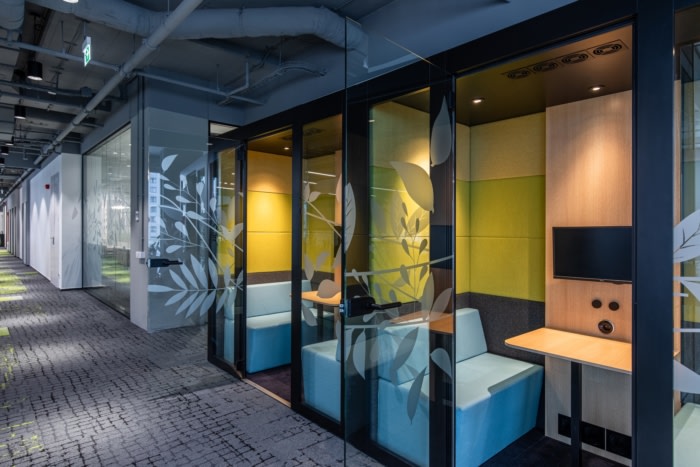 通过使用仿生学,设计师将有机形状的概念家具、受流体树枝启发的玻璃隔断箔、具有自然图案的地毯、唤起城市与自然环境之间同样强烈联系的地毯纳入概念家具中。漆成灰色的深色裸露天花板用作背景,以强调白色墙壁增强的自然采光。合作区由种植活植物、花盆和活墙的绿色角落完成。#办公室装修公司#