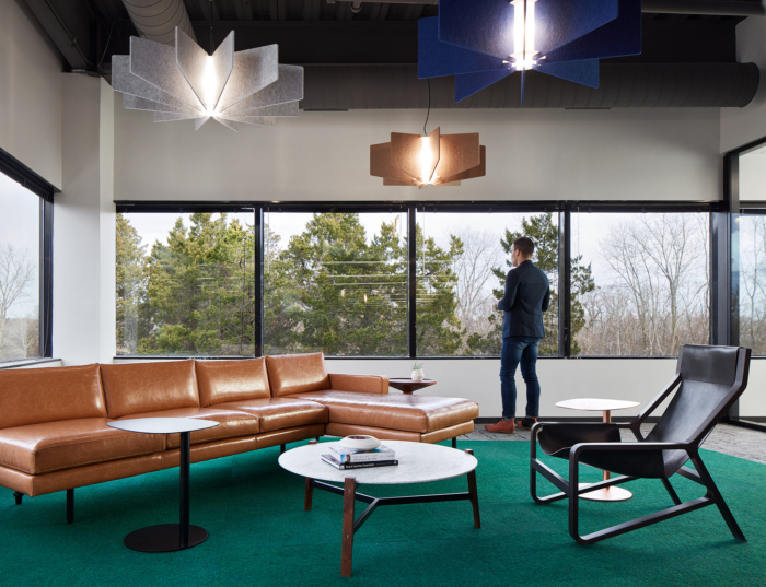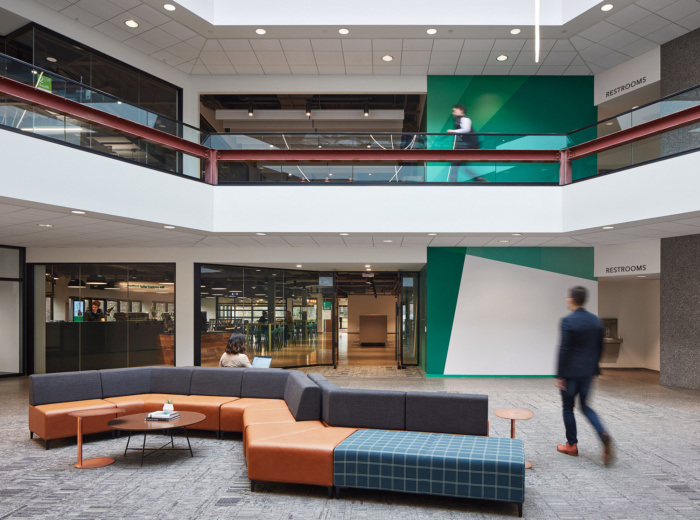 为了确保方便地使用食品储藏室、咖啡馆、跑步机站和广阔的视野,这座三翼物业需要在规划和寻路方面进行巧妙的设计。引人入胜的一楼大堂展示了周围的景观,同时为当前的团队成员、访客和未来的人才提供了一个诱人的入口空间。#企业办公室设计#
