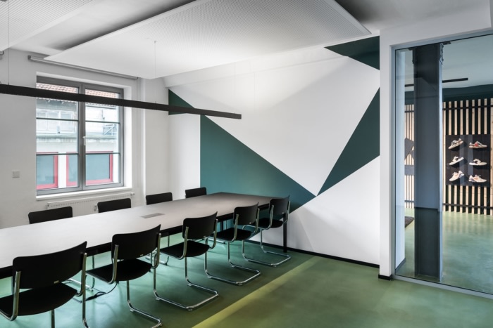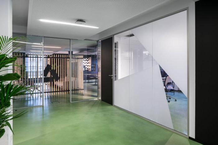 一楼前区设有团队和个人办公室。玻璃隔断与公共区域隔开,公共区域还包括代表会议室。办公室的玻璃隔墙在企业设计中采用半透明箔设计,部分允许视觉参考,部分又防止过多的洞察。#办公楼装修设计#
