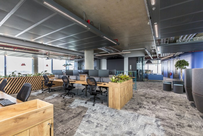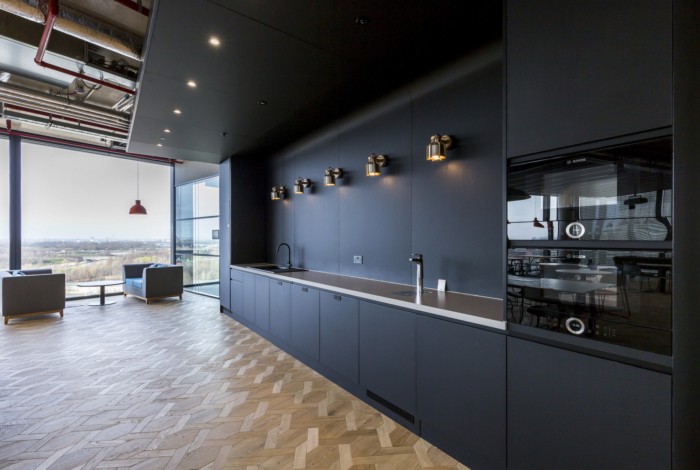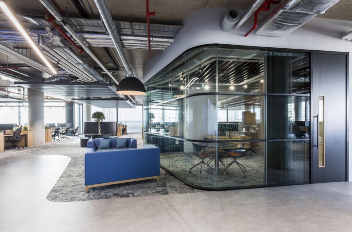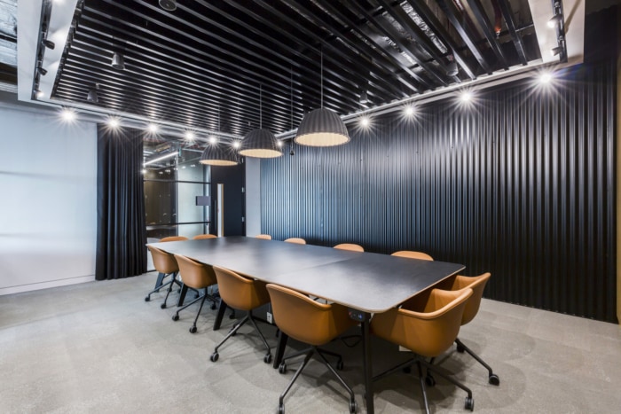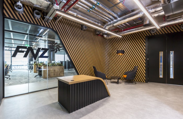 客户简报是要创建一个“成熟”的金融科技办公室。特色有角度的木鳍墙板突出了接待区内的弧形玻璃窗,而混凝土效果地板和波纹黑色金属接待台则反映了建筑物的工业暴露服务。#公司办公室装修#