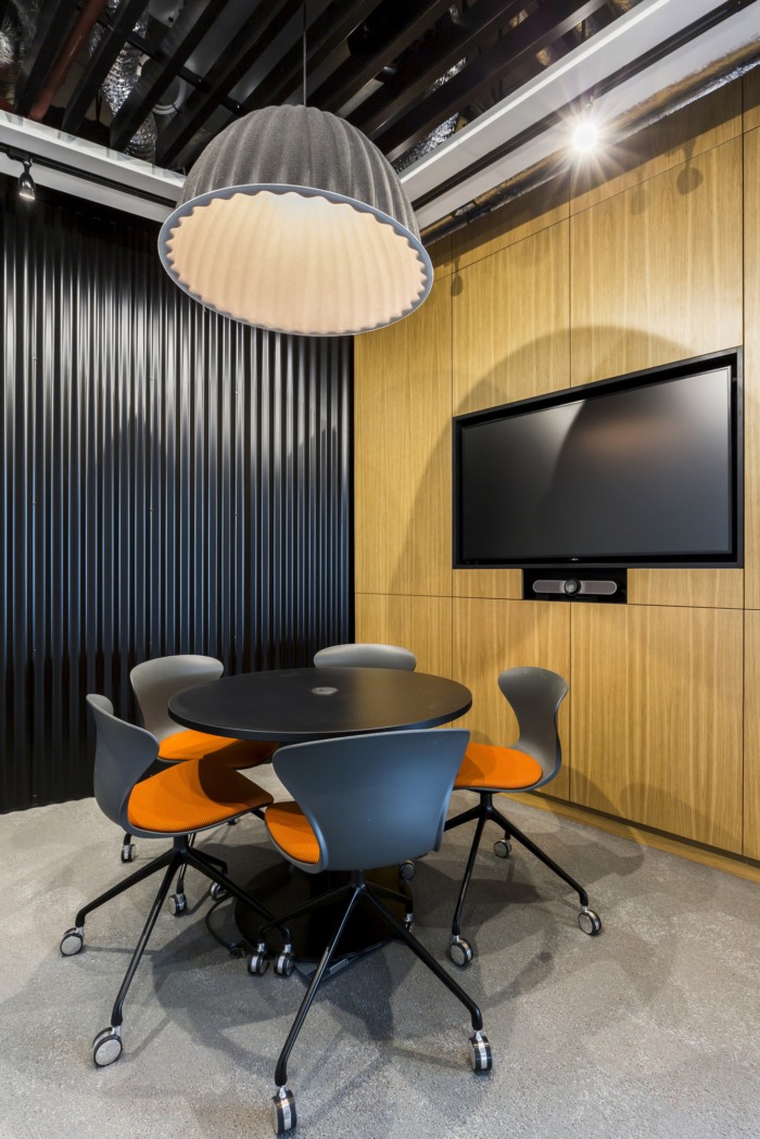 每间会议室内的嵌入式电视都环绕着木板储物墙。它们还包含所有隐藏的 AV 设备,使会议室具有清晰、干净的外观。客户的一个关键要求是拥有完全清晰的桌面,一个完全无线的视频会议 AV 系统以及安装在桌面下的电源装置保持了这一点。#专业办公室装修#
