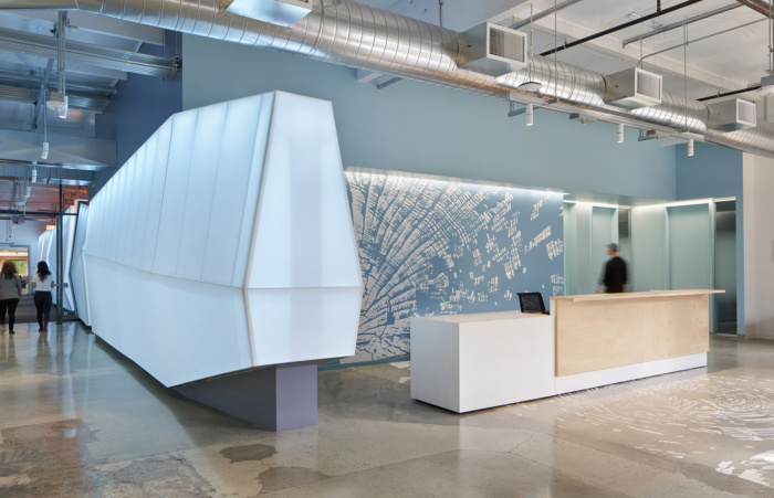 毛毛虫由半透明的白色织物制成,横跨定制的金属框架,在办公桌和会议室、休息室和厨房的创意混乱之间充当了一个加厚的门槛。作为开放式工作站的对立面,它产生了一种平静的感觉。沿着毛毛虫移动是与工作空间强度和空间感官的对比。虽然会议室典型的玻璃墙很熟悉,但经过高度调整的灯光和柔软的织物表面与反光玻璃搭配,却是一种意想不到的愉悦。#现代办公室装修风格#