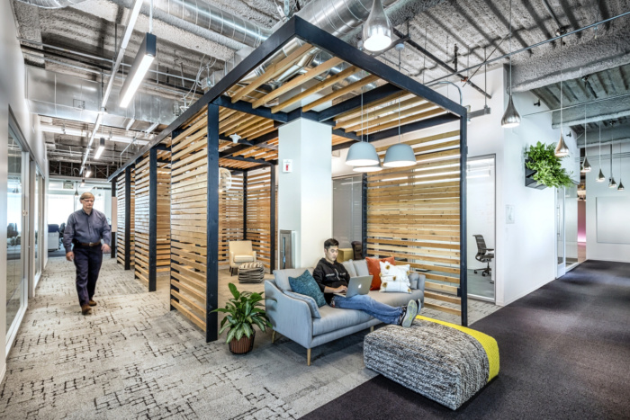 木制棚架与技术办公室形成了温暖、质朴的对比,用于将休息室连接在一起并建立清晰的寻路。格子的结构在结构上各不相同,从用于亲密交谈的线性、更狭窄的空间到用于大型团体聊天和非正式会议的更宽敞的客厅。这些不同的配置可以插入到地板上的各种布置中。通过在天花板条件上创造一个独特的转变,格子在休息室中建立了一种封闭感和亲密感,同时将空间与大型办公室区分开来,并增强了对自然光的访问。#高端办公室装修公司#