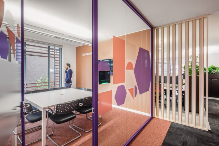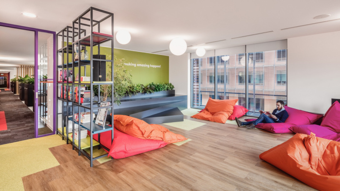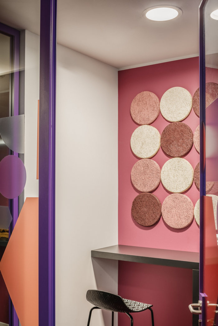 设计的关键也是客户要求将集团的品牌标识整合到空间中,用于窗户、窗户贴花和地毯,颜色与非常明亮的红色和紫色色调的组合在视觉上让人想起调色板公司标志。#公司新办公室装修效果#