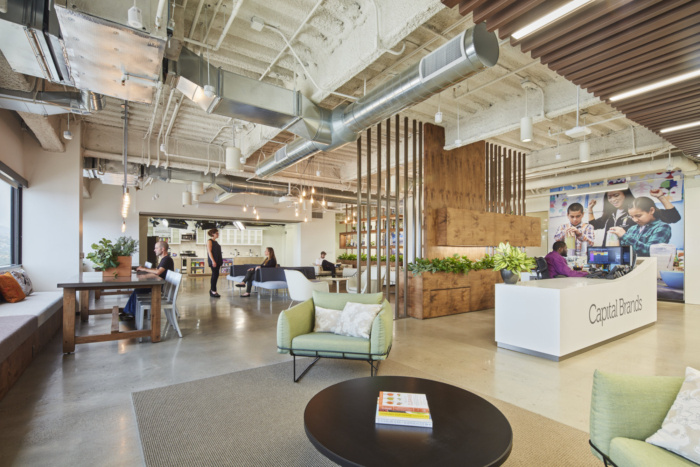 员工工作站用颜色和纹理反映了公司的品牌。花园的元素从公共区域迁移到员工空间:用再生木材包裹的共享工作区、混凝土纹理地板和木天花板格子创造了视觉目的地。墙上的大型彩色图形和艺术品为空间打上烙印,让员工为公司的使命和他们对生活产生积极影响的工作感到自豪。#办公楼装修设计效果#