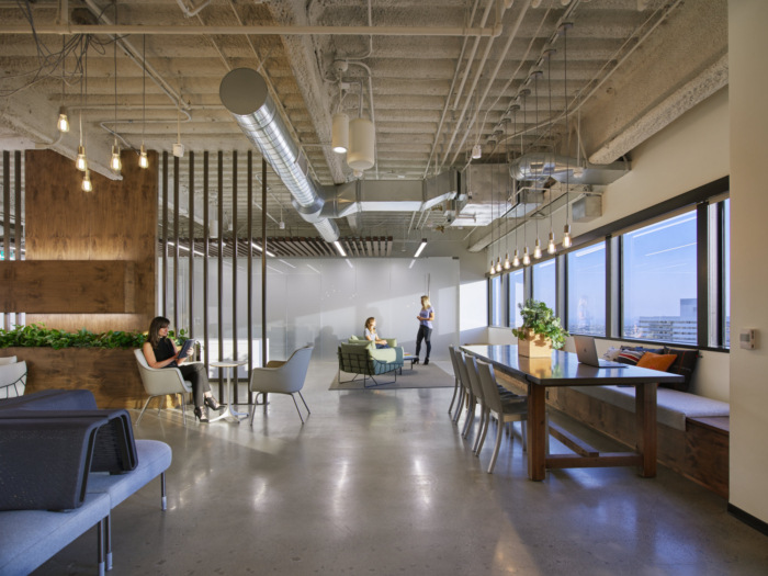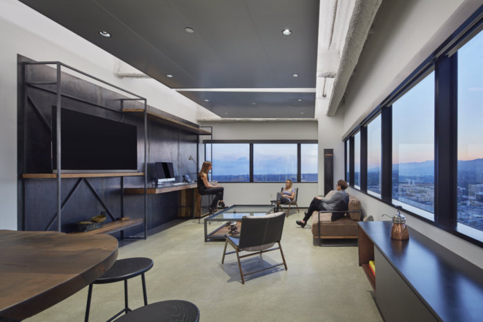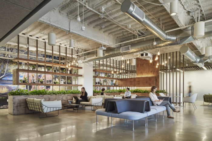 抵达主电梯大堂后,空间变得干净而中性,大屏幕显示公司的产品和愿景。天花板上的木格子将游客带到花园休息室,用再生木材和钢元素围起来。设计师开发了办公室中心花园休息室的概念,周围环绕着太平洋和远处圣莫尼卡山脉的景色。#办公楼装修设计公司#
