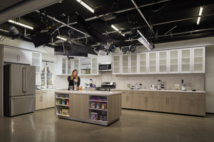 宽敞的花园休息室与示范厨房被天幕墙隔开,使房间具有多功能性。通过打开墙壁并重新布置家具以面对示范厨房,它成为现场营养演示的舞台。休息室、花园和公共空间使用类似于户外的材料并模仿户外客厅。#办公楼装修设计案例#