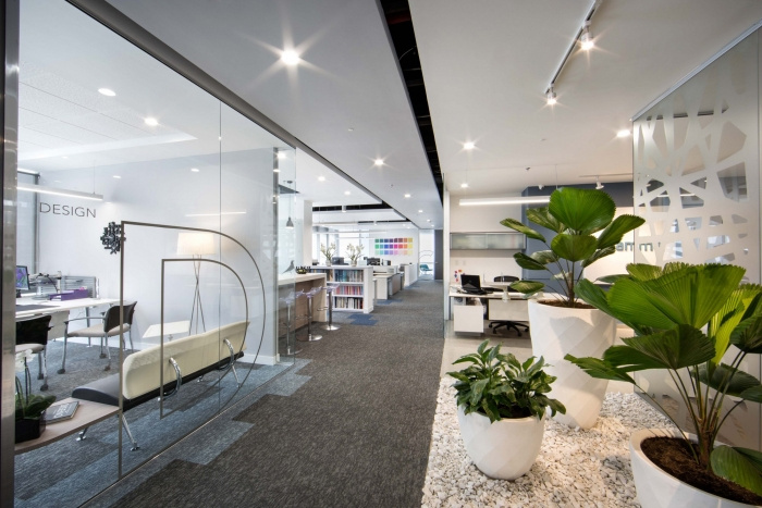 入口有一个直接的标志焦点,等候区壁龛上的灰褐色和灰色,以及大叶植物和白色石头,以融入自然元素。整个办公室的地板是深灰色的地毯,蓝色的点缀充满活力和图案。天花板设计结合了开放式彩绘,天花板和用于控制噪音的石膏板拱腹。#广州办公室装修公司#