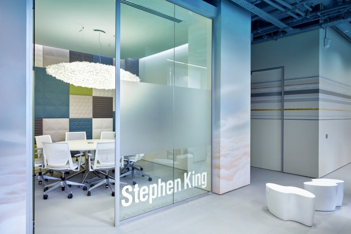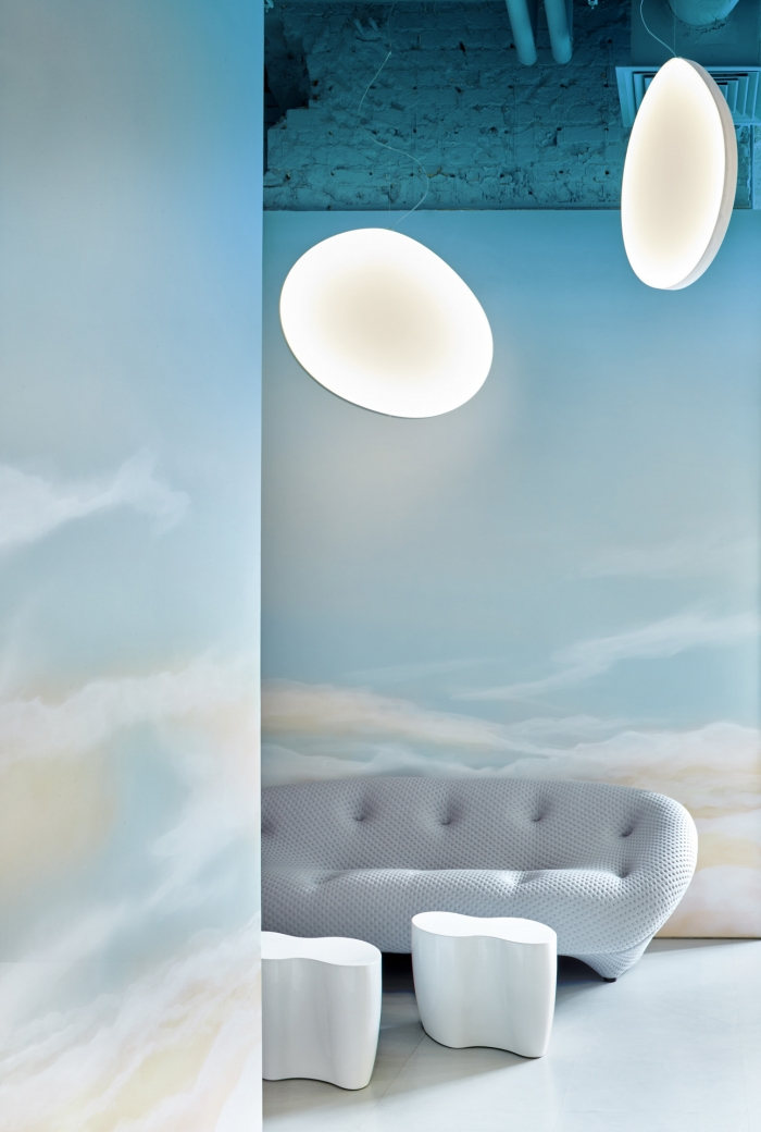 考虑到该建筑的历史,决定保留一些墙壁的原始形式,保留阁楼风格。开放式天花板通信被漆成蓝色,与饱和的早晨天空的形象相得益彰,墙壁和柱子上的彩色条纹,日出从入口处开始。#广州办公室装修公司#