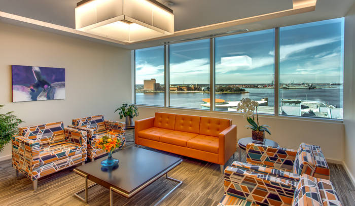 接待台由镶有玻璃的木饰面背板固定,该背板带有定制的蓝色薄膜,让人联想到水。接待台有一个嵌有发光的亚克力面板,上面有数字图像,对面的墙壁上举办了当地画廊的旋转艺术展览。建筑干净、时尚、现代,大堂的灯光很微妙,接待处和大堂休息区的框架是浅色的。#办公室装修效果图#