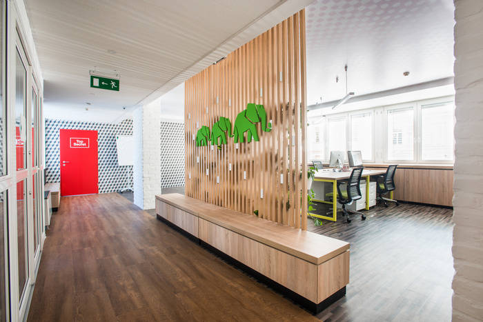 再加上办公室两端带有 3D 图案的瓷砖在大型彩色玻璃表面上的反射,以生动的色彩、开放的空间和绿色的表面。这是对现代办公室的愿景,即“成人游乐场”。#现代办公室装修#