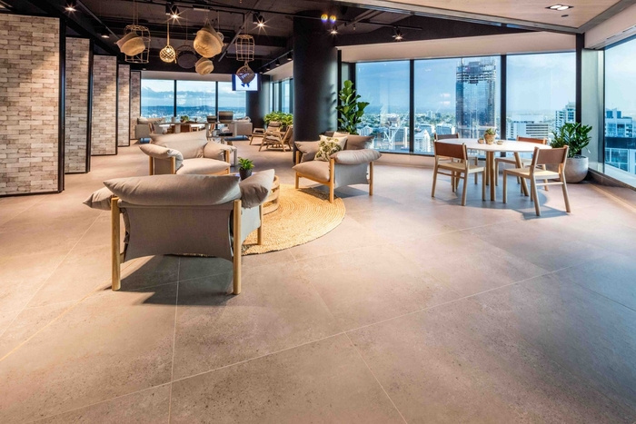 通向青翠的入口,布里斯班周围起伏的山丘和山谷在内部相互转换,郁郁葱葱的绿色植物、浅色的石头和模仿山坡起伏的分层接待台。自然光是空间的一大特色,营造出温暖而令人振奋的氛围,让人联想到城市本身。通过霓虹灯、铜管和城市元素等定制组件的对比,河流与城市景观的关系,鹅卵石般的地毯纹理和颜色反映了布里斯班的河床、水和当地植物群。#企业办公室装修公司#