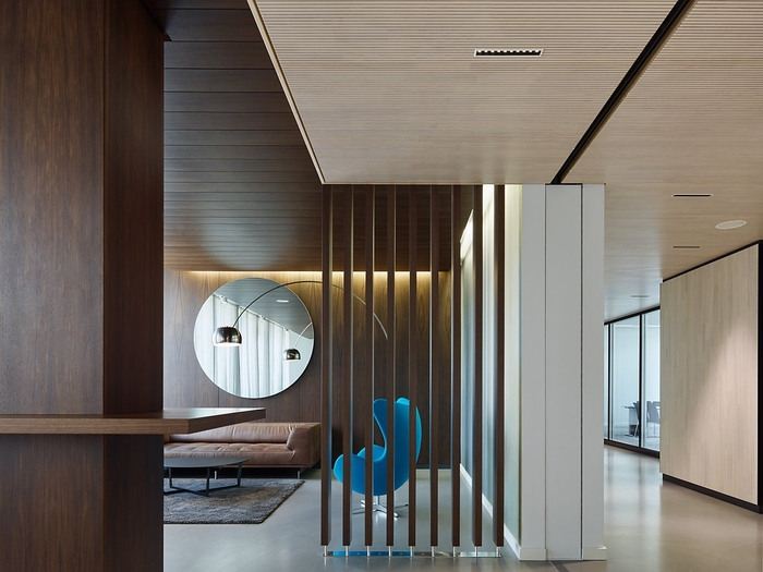 中央区域设有会议室、专为集中工作和复印站设计的小型私人房间。活动区域上方的木制薄片天花板有助于划分空间,并具有出色的声学特性。房间端墙上的一块大白板墙完成了它;墙壁及其后面的区域由各个楼层的单元单独使用。#广州办公室装修设计#