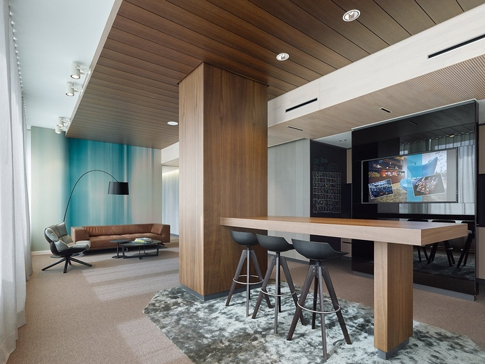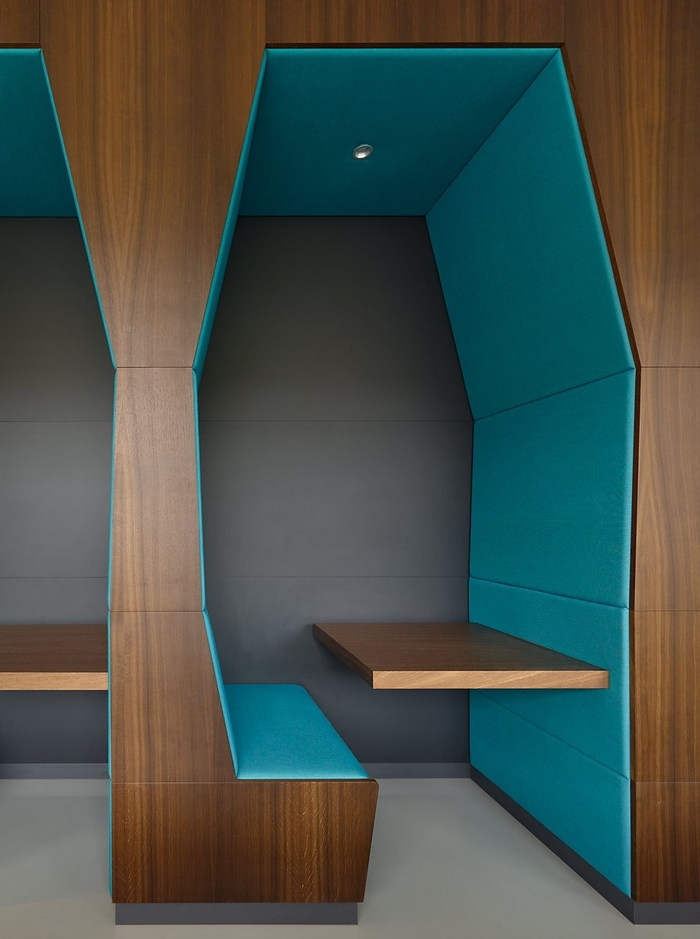 空间的核心是一个大礼堂,一个多功能空间,用于演示和活动,但也是共享休息的理想场所。宽敞的房间拥有友好而开放的氛围。浅色地板由矿物涂层砂浆制成,墙壁和座位平台由白色橡木制成。波纹效果的天花板,不锈钢瓷砖像水一样反射光线。同时,声学羊毛的穿孔和亚层确保了美好的空间声学。#公司办公室装修设计#