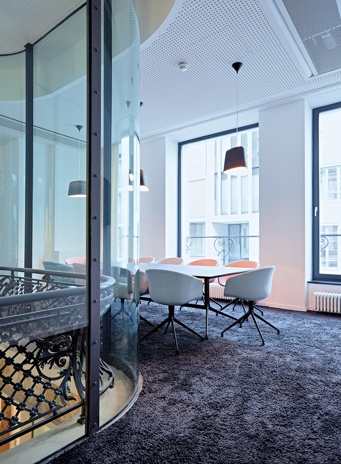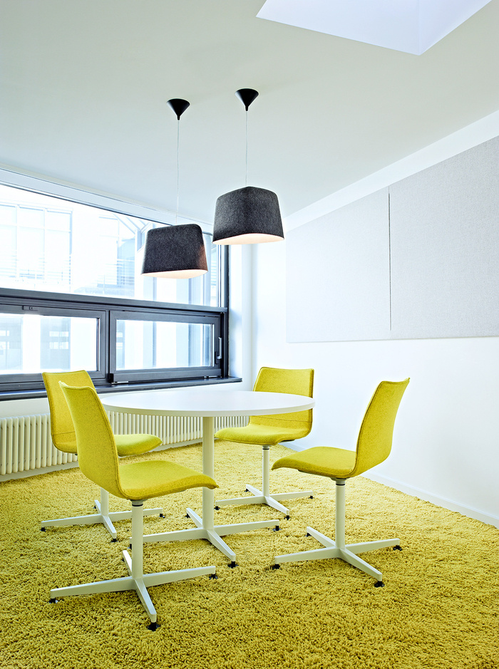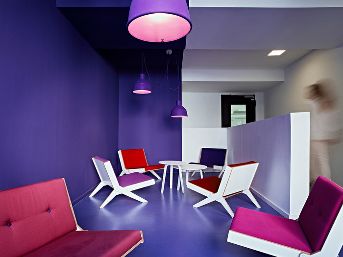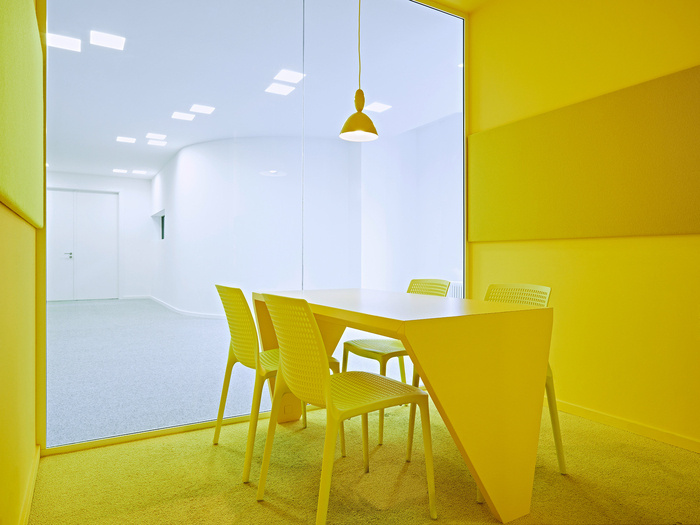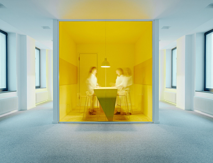 不同的配色方案标识工作区的功能。彩色会议箱作为建筑物中清晰可辨的定位点。每层楼都有特殊的空间,如复印机设施、厨房和站立式办公空间,作为重复出现的颜色点闪闪发光。#办公楼室内设计公司#