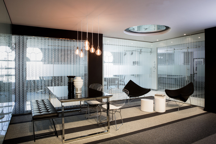 黑色元素在以白色和浅色为主的空间中的并置创造了一种强烈的设计声明——无缝和简约“一个线性的黑色环绕元素从地板流入墙壁和天花板,延伸到定制家具。这引导用户穿过空间并充当空间形成装置,为用户创造三维体验。#办公室高档装修案例#