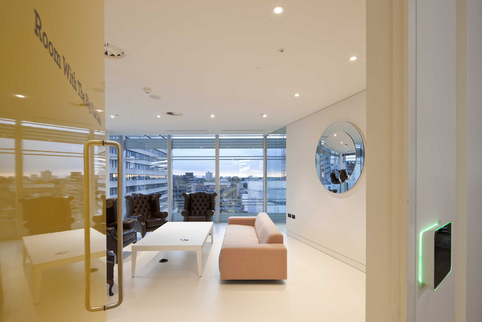 空间分布在三层楼,由办公室的视觉中心主导,这是一个定制的符合人体工程学的楼梯。流畅的清扫台阶逐渐变细到一个大平台,上面点缀着座椅垫,可以欣赏到趋势观看视频墙的美景。#办公空间设计装修#