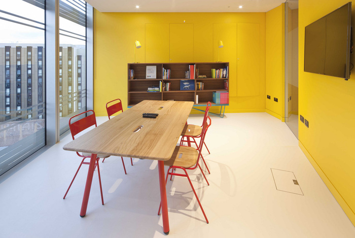 空间内有多种工作空间类型;带舒适座椅的小桌子、悬挂在天花板上的秋千座椅、之字形沙发、露台座椅以及公共储物区和创意咖啡吧区。新的露台是一个遮阳棚,里面摆满了时尚的花箱、明亮的蓝色露台家具和穿过玻璃墙进入室内的长凳。#办公空间设计公司#