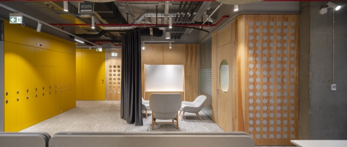 板块被切割,并安装了一个雕塑楼梯,以垂直连接每层楼的社交中心。楼梯是线和织物的隐喻,与街对面可见的历史悠久且享有盛誉的服装厂有关。打孔图案是“机器时代”的国际现代主义常见象征。尽管提到了工业过去和科技未来,但通过使用流线型、友好的形状、天然材料和柔和的色彩,这个地方温暖宜人:天然贴面(松木、白蜡木、橡木)、用于吸音元素的天然羊毛毡,木纤维天花板处理,软木隔音墙。#现代办公室装修案例#