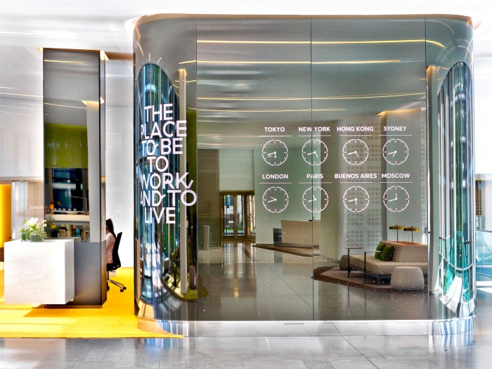 公共空间温馨、活泼、自发。自助咖啡吧和带迷人化妆镜的小型美容休息室和健康中心营造出一种安静的呵护氛围,像休息室一样的共享办公空间被称为“数字冰块”的亮绿色玻璃部分封闭。#广州办公室装修#