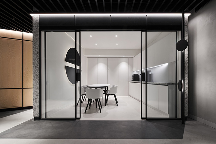 公共空间则采用了丰富的材料加以表达。会议室以木材为主;咖啡区则是混凝土和水磨石;公用设施区和卫生设施则采用了大量的不锈钢。地面采用了明、暗两种颜色的水泥地坪涂装——在亮色背景的衬托下,故意营造建筑物投影的视错觉意境,塑造丰富的空间层次感。#办公室装修设计案例#