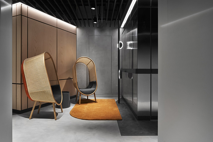 灵动有致的空间布局打破了长长的走道格局,将这里创建成一个由休息区、接待区和开放空间组成的流畅空间组织的多元灵动办公场所。各个空间分区结合材料的巧妙运用共同烘托出一个优雅质感的品质空间。为了增强室内的通透性和轻灵感,工作区的玻璃隔墙都采用最小的金属边框;同时铺以地毯创建良好的声学氛围。#办公室装修设计公司#